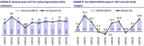 * Consolidated revenue grew 12% YoY (+24% QoQ) to INR18.2b (in line), the highest in last two years, driven by the recovery in box office (with 12 films crossing INR1b mark in 2Q).