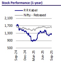 RRKABEL’s volume growth in 1Q was below the industry average due to the spillover of domestic orders and cable capacity operating at optimum levels. The ongoing expansion at the Waghodia plant is estimated to boost cable volumes over the next three years. Management remains confident of achieving its fullyear volume growth guidance of ~18%, supported by a robust 25% growth in cables during 9MFY25. Additionally, the company projects to achieve break-even in the FMEG business in FY26. We value RRKABEL at 30x Sep’27E EPS to arrive at a TP of INR1,340. Reiterate Neutral.