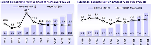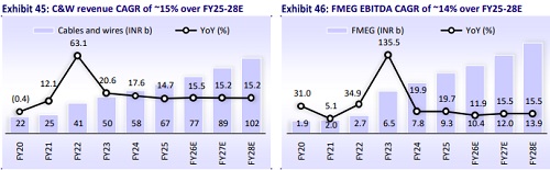 We estimate RRKABEL’s revenue/EBITDA/PAT CAGR at ~16%/23%/20% over FY25- 28. Further, we estimate OPM to expand to ~8% over FY27-28E vs ~6% in FY25, aided by an increase in cable contribution to overall revenue. The C&W segment’s revenue posted a CAGR of ~24% over FY19-25. Going forward, we expect ~15% revenue CAGR for the C&W segment over FY25-28. In the FMEG segment, the company’s revenue posted a CAGR of ~44% over FY19-25. We estimate ~14% revenue CAGR in this segment over FY25-28. Its cumulative OCF is projected at INR12.7b over FY26-28 vs. INR12.9b over FY23-25. Cumulative net cash outflow is estimated to be INR1.2b over FY26-28 vs FCF of INR6.2b over FY23-25, driven by higher capex.