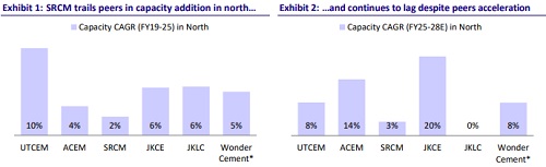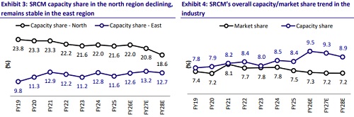 * SRCM has been comparatively slower than its peers in terms of capacity expansion in its core markets in the north region. Its north region capacity CAGR stood at ~2% over FY19-25 vs. peers’ range of ~4-10% during the same period. Going forward, the company’s capacity CAGR is estimated at ~3% over FY25-28E, significantly lower than its peers’ range of ~8-20% during the same period (Exhibit 1 & 2).