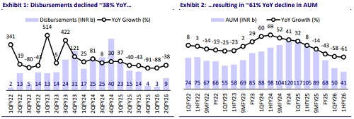 AUM dips ~61% YoY; disbursements down ~38% YoY