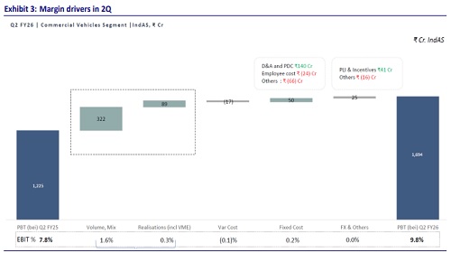 The industry’s pricing discipline has certainly been commendable over the last 12 months, with all CV players witnessing improvement in margins. However, the key concern in TTMT CV business has been its gradual loss of market share across key segments. Particularly worrisome is the market share loss in LCV goods from a high of 40% in FY22 to 27% now, and the gap with the current market leader MM is rising with every passing year. Even in MHCV goods, its market share has declined to 49% from 54% in FY22. In the MHCV bus segment, its market share has come down to 30.3% in 1HFY26 from 38% in FY22. Further, its recent acquisition of Iveco would expose it to the ongoing global macro uncertainties, thereby driving a potential derating, if the demand environment does not improve anytime soon. Given the lack of any visible triggers, we rate Tata Motors CV business at Neutral with a TP of INR341 per share – we value the core business at 11x Sep’27E EPS (in line with peers) and add INR12 per share for its stake in Tata Capital.