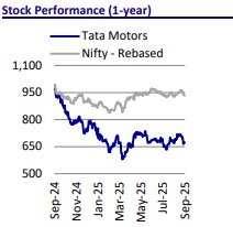 We attended Tata Motors’ (TTMT) analyst meet hosted by the management to give updates on various business segments. The company’s India PV segment is witnessing a pickup in demand after GST rate cuts, and management expects the segment to post 8- 10% growth in 2HFY26. Moreover, TTMT expects to outperform the overall domestic PV segment on the back of its new model launches, leadership in the compact SUV segment, and rising demand for its EV and CNG variants. In CVs, management expects demand to pick up in 2H, backed by increased consumption and improving profitability of fleet operators. Synergy benefits with IVECO include complementary product and regional mix and commonality of sourcing and scale benefits. The demerger process is on track, with the effective date of 1st Oct’25. After the completion of all formalities, its PV entity is likely to get listed first, followed by the CV entity. At JLR, the cyber incident has disrupted production for most of Sep’25, and hence it has lined up funding lines to ensure that sufficient working capital is available at all times. While JLR has now indicated a phased production start, it is likely to take some time for production to return to normalcy. Nonetheless, JLR is facing several headwinds, which include: 1) tariff-led slowdown for exports to the US; 2) demand weakness in key regions like Europe and China; and 3) rising VME, warranty and emission costs. For the lack of any triggers, we reiterate our Neutral rating on TTMT with Sep’27E SoTP-based TP of INR686.