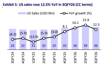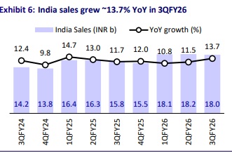 ? Torrent Pharma (TRP) delivered a better-than-expected performance, with 3%/5%/10% beat on revenue/EBITDA/PAT in 3QFY26. Growth was aided by consistent superior execution in domestic formulation (DF)/LATAM, favorable currency benefits in the US, and a lower tax rate.