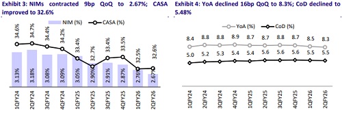 * NII declined 2.6% YoY and 3.3% QoQ to INR88.1b (largely in line with MOFSLe). NIMs stood at 2.67% (down 9bp QoQ, vs our est of 2.67%).