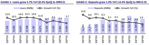 * Loan book grew 5.7% YoY/0.2% QoQ to INR9.48t, while deposits grew 1.9% YoY/ declined 0.4% QoQ. CD ratio increased to 76.8% (up 51bp QoQ).