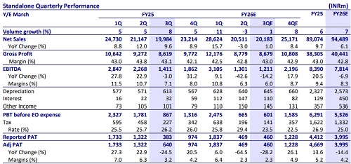 * Demand environment for beer players moderated in 3Q due to the off-season (extended monsoon and earlier winters). We model 1% revenue growth and 1% volume growth YoY.