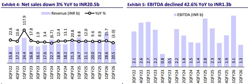 * In 1HFY26, net sales grew 7%, while EBITDA and APAT declined 14% and 25%, respectively.