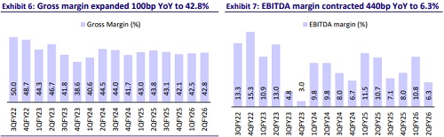 * Big miss on margins: Gross margin contracted 100bp YoY to 42.8% (est. 44%, 42.5% in 1QFY26). Employee expenses grew 6% YoY, and other expenses rose 7% YoY. EBITDA margin contracted 440bp YoY to 6.3% (est. 9.8%, 10.8% in 1QFY26). After delivering an improved margin trajectory, there was a sharp contraction in margin in 2Q.