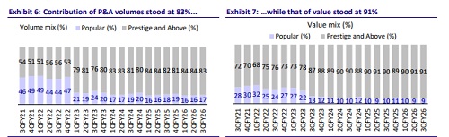 * In-line sales, volume below expectation: Standalone net sales rose 7% YoY to INR36.8b (est. INR36.7b) in 3QFY26. P&A revenue (90% revenue mix) was up 8% YoY, while popular revenue fell by 5% YoY. The top half of the portfolio delivered a solid performance, which was partly offset by policyled headwinds in Maharashtra and the impact of one-time retail pipeline fill in AP in the base (15% growth in 3QFY25). Total volume declined by 3% YoY (est. +2% YoY, 8% in 2QFY26), with P&A volume down 2% YoY (est. +2.5% YoY, 8% in 2QFY26) to 14.6m cases. Excl. AP, P&A volume growth was flat YoY. Excl. Maharashtra, P&A volume grew by 6%, implying healthy growth in the rest of India. P&A revenue growth (excl. AP) stood at ~10% and excl. Maharashtra, it was 14%. Popular volume fell 9% YoY (est. +2% YoY, 6% in 2QFY26) to 2.9m cases due to MML impact.