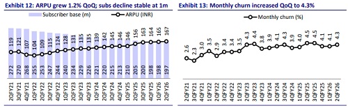 * Vi’s overall subscriber base at 196.7m declined 1m QoQ (vs. 0.5m net declines in 1QFY26 and in line with our estimates).