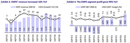 * Segmental highlights: 1) UCP – Revenue dipped 23% YoY to INR12.2b, and loss stood at INR458m vs. EBIT of INR1.2b in 2QFY25; 2) EMPS – Revenue rose 10% YoY to INR9.7b, PBIT grew ~99% YoY to INR920m, and EBIT margin surged 4.3pp YoY to 9.5%; 3) PES – Revenue dipped 5% YoY to INR1.4b, EBIT rose ~11% YoY to INR439m, and EBIT margin expanded 4.6pp YoY to 31.6%.