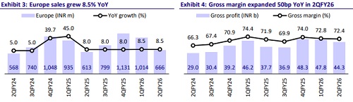 * Zydus Lifesciences (ZYDUSLIF) delivered in-line revenue/EBITDA in 2QFY26. There was a marginal miss on earnings due to higher depreciation, lower other income and a higher tax rate.