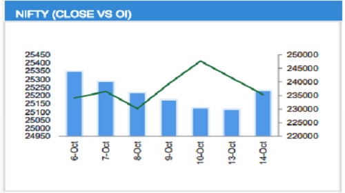 The Nifty 50 settled at 25,145, ending the session on a negative note as selling pressure emerged near the 25,300 level. Derivatives data reflected fresh Call OI build-up at the 25,200 and 25,300 strikes for the upcoming weekly expiry, suggesting a potential hurdle for any move towards 25,500. On the daily chart, the index maintained a sideways to bullish tone as long as the 25,000 level remains intact. However, a decisive break below this key level could propel a decline towards the 24,800 zone.