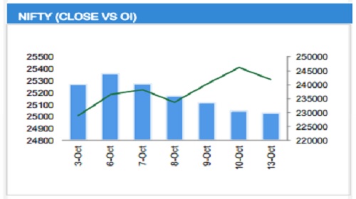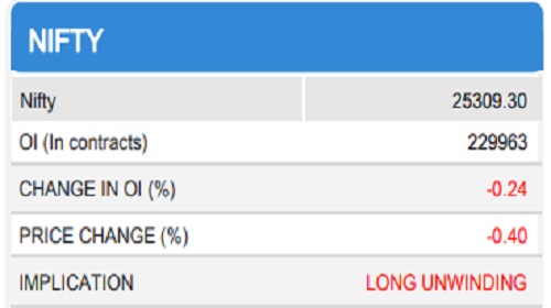 The Nifty 50 closed at 25,227, marking a muted session after a gap-down opening, while exhibiting resilience near the 25,150 level. On the derivatives front, significant OI build-up was observed at the ATM Call strikes, indicating limited upside potential and a possible capping of gains at higher levels. On the downside, a decisive move below 25,150 could trigger a decline towards the 25,000 mark, where substantial Put OI is concentrated.
