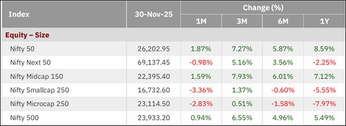 The broader market also delivered healthy gains, with the Nifty 500 gaining 0.94% in November 2025, with large and midcap up about 1-2% and smallcaps corrected by around 1-3%. Over the last 3 months, 6 months, and 1 year the index has consecutively given positive returns of 6.55%, 4.96% and 5.94%.