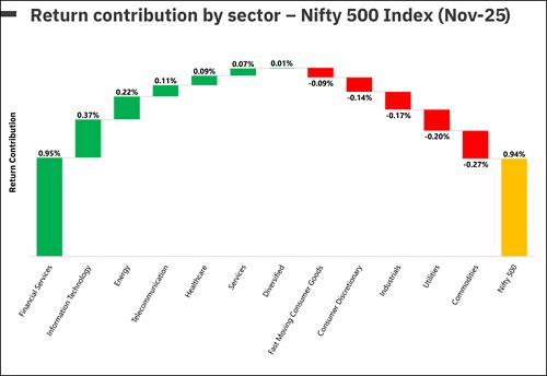 Financial Services, Energy & IT were the major contributors to the overall returns of the Nifty 500 index.
