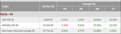 US equities were broadly flat in November, with the S&P 500 up 0.13% while the NASDAQ100 declined 1.64%. Sector performance in the S&P 500 was mixed, as Healthcare, Communication Services and Financials added positively to returns, while IT and Consumer Discretionary weighed on the index. Emerging markets showed divergence with Brazil (+7.42%) and South Africa (+3.87%) posted gains, others saw a declineof 2-7%.
