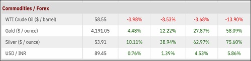 Safe-haven assets outperformed with a surge in Gold and Silver of 4.48% and 10.11% in November. Crude oil (-3.98%) and cryptocurrencies like Bitcoin and Ethereum saw double-digit drawdown. On a yearly basis, Gold advanced 58.09%, while Silver delivered an even stronger performance, surging 75.60% over the year. In contrast, Crude Oil declined and is down 13.90%.
