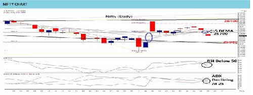Nifty 50 is poised for a cautious week and is likely to remain range-bound to mildly bearish, with 25400 emerging as the key pivot. Multiple technical studies indicate immediate support in the 25400–25250 zone, followed by a stronger demand cluster near 25000, where key retracement levels and long-term averages converge. On the upside, immediate resistance is placed at 25700–25850, with a heavier supply zone near the 25900–26000 band, which is expected to cap gains during the week. Friday’s sharp sell-off has weakened the short-term structure, while derivatives data point to fresh short build-up, increasing downside risk if 25400 fails to hold. That said, a technical bounce on Monday cannot be ruled out after the sharp decline. A decisive break down below the 5 & 20 DMA convergence zone near 25460 could open the door for a move toward 25300.Consolidation between 25850 and 25240. A bullish bias emerges only on a sustained move above the upper band, while a clear corrective phase is likely on a confirmed break below 25400.