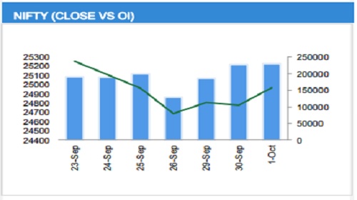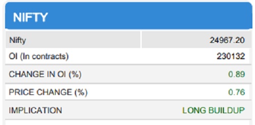 The Nifty 50 closed at 24,836, posting a positive session with a strong rebound from its immediate support level of 24,600. However, on the daily chart, the index continues to trade below its key long term moving average, the 50-day EMA at 24,900, indicating potential selling pressure near this level. On the derivatives front, a significant Put OI build-up at 24,700 and 24,600 highlights a strong support zone, while on the upside, notable Call OI concentration at the 25,000 strike suggests a psychological hurdle.
