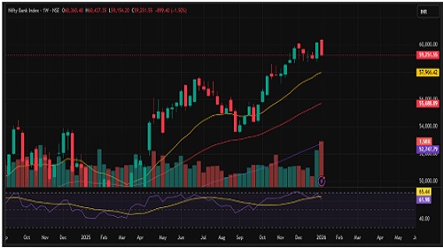 Bank Nifty began the week by registering a high of 59,251. After marking an all-time high of 60,437, the index witnessed profit booking for three consecutive sessions, reflecting short-term exhaustion at elevated levels and cautious sentiment among market participants. If selling pressure re-emerges and the index decisively breaks below 59,000, it could trigger a deeper corrective move toward the 58,700–58,600 zone, with scope for further downside if weakness persists. On the upside, immediate resistance is placed at 59,500, followed by 59,850 and the psychological 60,000 mark.