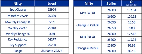 Weekly & Monthly Change : Nifty is up by 0.38% at 25966 on a weekly basis. Nifty VWAP of the week is near 25940 levels and it is trading 25 points above the same. On the monthly scale, the Index is up by 5.51% while VWAP is near 25380 levels and it is trading 580 points above the same which indicates overall bullish stance with buy on dips for the expiry day point of view.