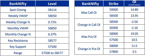 Weekly and Monthly Change : Bank Nifty is trading up by 0.72% at 58114 on weekly basis. Bank Nifty VWAP of the week is near 58050 levels and it is trading 65 points above to the same. On monthly scale Index is up by 6.37% while VWAP is near 56850 levels and it is trading 1250 points above to the same which suggests positive bias for expiry day point of view.