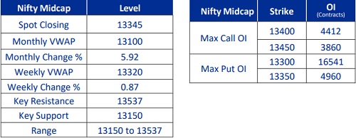 Weekly & Monthly Change : Nifty Midcap select is up by 0.87% on a weekly basis. It’s VWAP of the week is near 13320 zones and it is trading 25 points above the same. On monthly scale Index is up by 5.92% while VWAP is near 13100 levels and it is trading 250 points above the same which indicates bullish stance for the expiry day point of view.