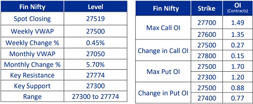 Weekly & Monthly Change : Fin Nifty is trading marginally higher by 0.45% at 27519 on weekly basis. Fin Nifty VWAP of the week is near 27500 levels and it is trading near to the same. On monthly scale Index is up by 5.75% while VWAP is near 27050 levels and it is trading 470 points above to the same which suggests overall positive stance for expiry day point of view.