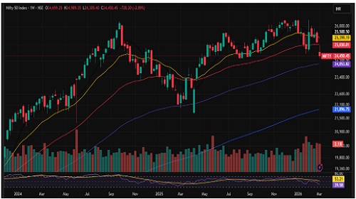 The NIFTY 50 experienced sharp intraday volatility during the week, reflecting heightened uncertainty and sustained selling pressure in the market. The index began the week with a sharp gap-down of nearly 500 points, indicating weak market sentiment and aggressive bearish positioning. The decline extended further, with the index touching a weekly low of 24,305. Although Nifty attempted a recovery afterward, it failed to maintain momentum and eventually closed at 24,450.45, registering a weekly loss of 728 points (-2.89%), highlighting continued weakness in the broader market structure.