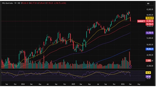 The NIFTY Bank concluded the week on a negative note, settling at 57,783, marking a weekly decline of 1,272.60 points amid elevated volatility. The index showed weak price action after breaking below the crucial support level of 58,550 and forming a bearish candle for the second consecutive week on the weekly chart, which signals continued selling pressure and a bearish bias in the near term.