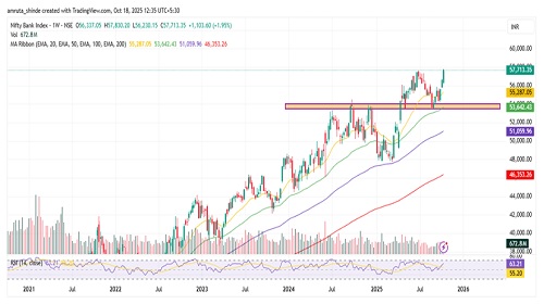 Bank Nifty ended the week on a strong note, closing at 57,713 after rising nearly 1,103 points. The index displayed notable strength by surpassing the crucial 57,500 level and recording its third consecutive weekly gain. Earlier, it broke out of the 53,500–54,000 resistance zone and later retested this area, which has now turned into a solid support base, confirming a successful breakout retest. The move above the recent swing high of 57,628 further validates the ongoing bullish momentum. On the daily timeframe, Bank Nifty has also broken out of a rounding bottom pattern, indicating the potential for a sustained uptrend.
