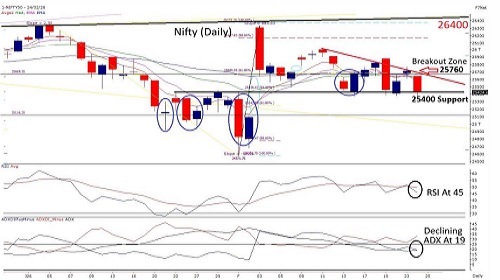 Nifty began the March series on a positive note, opening above the key psychological support of 25500. It attempted to cross the 50- DEMA resistance near 25,660 but failed to sustain higher levels and closed around 25480, forming an Inside Bar candlestick near the crucial 25,400 support zone. The index continues to defend this level, which has emerged as a strong base since last few sessions. The February series witnessed sharp volatility, with swings between 26340 and 24570, before settling near the midpoint around 25400. March, however, carries a favorable seasonal bias, historically associated with strong directional moves, often on the upside. Technically, the successful defense of the major demand zone near 25400, along with a Bullish Engulfing pattern and follow-through buying, reinforces this support. A breakdown below 25400 could drag the index toward 25040. On the upside, immediate resistance lies near 25760, followed by 25850 and 26000. The broader bullish structure remains intact as long as Nifty holds above 25400.