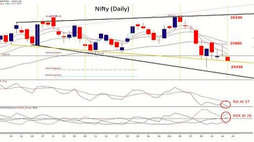 began the week on a weak note but ended the session with yet another bullish reversal candlestick on the daily chart, reinforcing the pattern of recurring reversals that signal gradual demand emergence near supports and exhaustion of the corrective phase within the broader 25880–25430 band. The key overhead resistance remains at 25880, coinciding with the 50 DEMA, and these bullish signals will gain technical validity only if the index decisively breaches and sustains above this level on a closing basis. Options data indicates a range shift towards 25500– 26000, with a mild bias pointing to strong support near the 25500 zone for the current weekly series, suggesting the potential for sharp swings on either side of the 25880–25500 band during the week. A decisive close above 25880 would signal a revival in trend strength and open the door for an upside move towards and beyond 26130, while failure to reclaim this level may keep the index trapped in a volatile, range-bound phase, warranting a cautious approach with focus on mean-reverting trades as long as the broader range holds.