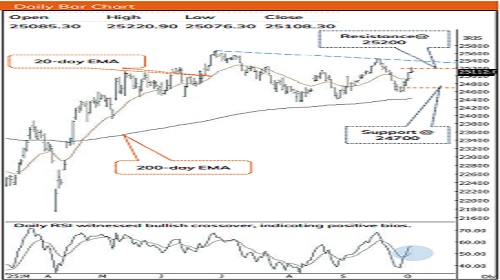 * Key point to highlight is that, the formation of higher-high-low continued over the fourth consecutive session however, lack of broad-based buying resulted in profit booking at higher levels. Going ahead, for a meaningful pullback to materialize, index need to decisively close above 25200, else continuation of consolidation in 25200-24700 zone amid stock specific action can be expected ahead of Q2FY26 earning season. Strong support is placed at 24700 which is 80% retracement of the current upmove.