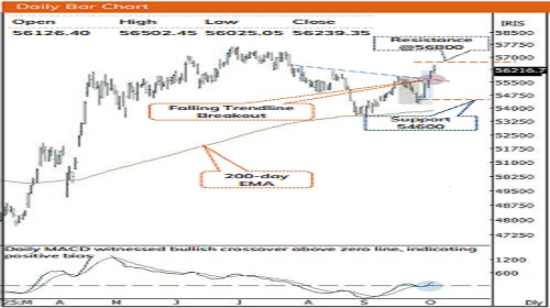 * Key point to highlight is that, Bank Nifty has witnessed a sharp rally of nearly 2200 points over the past six session, indicating strong upward momentum. However, a brief consolidation phase cannot be ruled out, with the index likely to oscillate within the 55600-56800 band in the near term. A decisive breakout above 56800 would confirm the continuation of the uptrend, paving the way for a retest of its all-time high 57600. Therefore, any dip from current levels should be seen as a buying opportunity, with immediate support placed near 54,600, representing the 80% retracement of the ongoing up move (54,226-56,164).