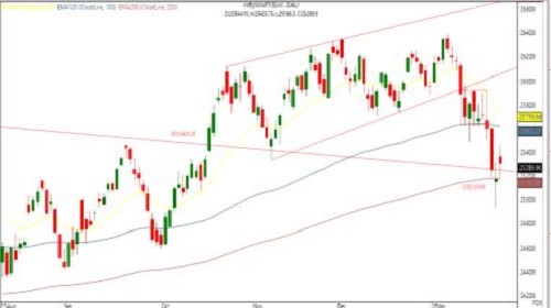 * From a technical perspective, the Nifty is hovering around its long-term moving average, the 200-day DEMA near the 25,150 level.