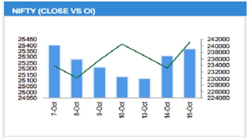 The Nifty 50 closed at 25,323, marking a positive session and successfully surpassing its immediate resistance at the 25,300 level. On the derivatives front, fresh Put OI build-up was observed at the 25,300 and 25,200 strikes, indicating that sustaining above these levels may open the door for an upside move toward 25,500, where significant Call OI is concentrated. On the daily chart, a trendline resistance is placed near 25,450, and a decisive breakout above this key level would be essential to extend the bullish momentum towards 25,600 and 25,800 in the near term.