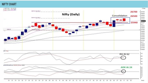 Nifty continued to oscillate within a progressing Channel Pattern formation. Yesterday’s uptick from the pattern base also appears to be part of an ongoing inverse head & shoulders formation, with its neckline positioned near 26050. On the daily chart, the index managed to hold above its 20-DEMA for the second consecutive session, reaffirming this zone as the immediate demand area. A close below this level, however, may weaken the short-term bullish bias and expose the index to further downside toward the 50-DEMA at 25680, or potentially lower. The recent appearance of a Spike candlestick formation offers a ray of hope for the bulls, signalling a possible rebound toward the 26330 zone. With the index hovering near the lower end of its broader range of 26330–25940, traders are advised to remain cautious and consider adding long positions only after a decisive breach above 26110. The 26100 zone is expected to provide favourable opportunities to accumulate fresh longs. On the upside, a sustained move above 26330 is likely to trigger a strong bullish thrust, helping the index maintain a higher base near the 26000 mark. Options data for the December series indicates a firm put base in the 26000–25800 range, while resistance is gradually shifting toward 26500, reflecting improving underlying sentiment. Overall, Traders may continue to hold long positions as long as 25940 remains intact, with near-term upside targets placed at 26330 and 26500 for the week.