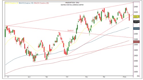 * Technically, the Nifty has breached the lower band of its rising channel and retested the crucial support zone around the previous swing low near 25,880.