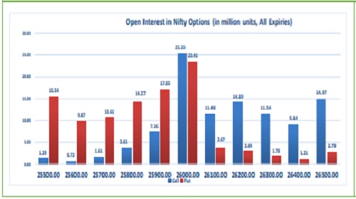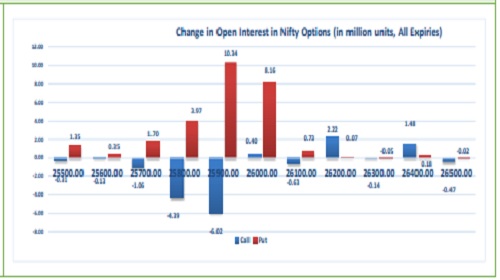 Highest OI build-up is seen at 26000 strike Calls and 26000 strike Puts, to the tune of 25.33mn and 23.41mn respectively.