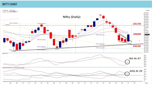 Nifty ended its losing streak with a long-range bullish bar that engulfed the past three sessions’ decline, kicking off October on a strong note. Seasonality favors the bulls, with seven positive Octobers in the past decade, though the sharp declines of 2018 (-5%), 2023 (-2.9%), and 2024 (-6.2%) remind traders to temper optimism with caution. Technically, the index closed above the 24820 hurdle, but RSI remains below 50 and ADX continues to signal weakness. Sustained closes above 24820 would be key to triggering short covering toward the psychological 25000 mark and eventually the 25170 zone. That said, price action still lingers below its 50-DEMA (24900) and 5-WEMA (24870), leaving the structure fragile. Immediate support is placed at 24700, while option data suggests a broader base near 24,000. A dip below 24600 could extend downside risk to 24200. Sectoral divergence persists, with defensives offering resilience even as cyclicals stay under pressure. Until a confirmed reversal emerges, traders are advised to stay hedged, remain selective, and avoid complacency.