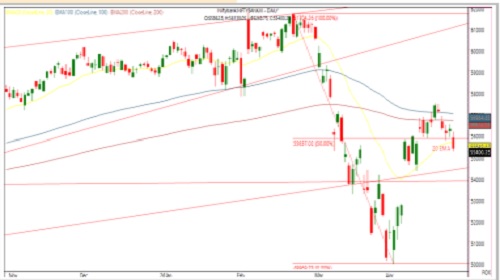 * Immediate resistance is observed near 56,500, with key support at 54,300.