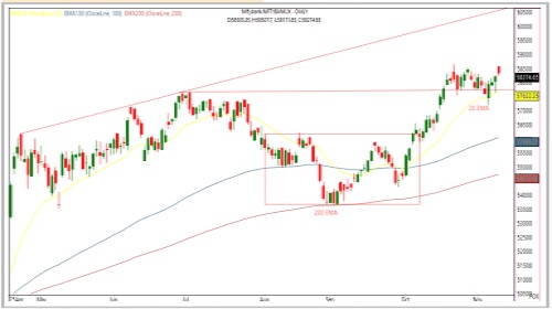 * Immediate resistance is observed near 59,000, with a defined support zone around 57,600.