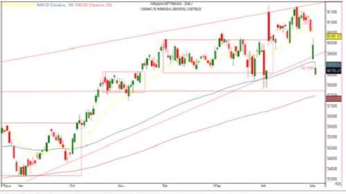 * Immediate resistance is seen near 59,600, while critical support lies around 57,900 in the near term.