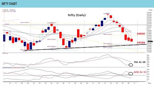 Nifty extended its losing streak to the eighth consecutive session, forming a series of lower highs and lower lows that reinforces the ongoing downward spiral. The index surrendered its entire monthly gains, closing September at 24611, only slightly above its opening zone of 24432, after hitting a high of 25,448 earlier in the month. Historically, October has favored the bulls with seven positive closes in the last 10 years. However, exceptions in 2018, 2023, and 2024 saw sharp declines of 5%, 2.9%, and 6.2%, respectively, reminding traders of the risks in seasonal optimism. On the technical front, daily RSI continues to weaken while ADX remains firm above 31, indicating further downside potential. The index is also trading below its 5-WEMA (24780) and 20-WEMA (24680), strengthening the bearish tone. Options data reflects a steady downward shift in trading range, with 24700 now as the immediate hurdle and 24000 forming the lower boundary. Sectoral divergence persists, with defensives holding ground while cyclicals remain under pressure. A breach below 24600 could open room toward 24200. Traders should remain cautious, hedge longs, and await a confirmed reversal before reducing protection.