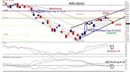 Nifty continued its decline but managed to hold near its 20 DEMA support, indicating some buying interest at lower levels, even as a breakdown below the recent Inside Bar pattern low with a minor gap and a negative crossover of the 5 & 50 DEMA reflect short-term weakness. The zone around 24310 now acts as immediate resistance, and only a sustained close above this level can signal a potential trend reversal, while on the downside, a consecutive close below 23800 may trigger further unwinding and likely accelerating weakness towards 23500–23150. Momentum indicators continue to suggest consolidation, as ADX remains below 25 and RSI has slipped below the 50 mark, while derivative data indicates that sustaining above the 24200–24300 Call OI cluster is crucial for any bullish revival, with PE support likely shifting lower towards 23500. Despite near-term volatility, the broader structure remains constructive as long as Nifty holds above 22950; however, upside may remain capped due to elevated crude prices, a firm USD/INR, persistent FII outflows, and geopolitical uncertainties. As long as the situation in the Strait of Hormuz remains unresolved, and Washington and Tehran continue to send conflicting signals, markets are likely to remain highly sensitive to developments emerging from the Middle East, especially given the strait’s critical role in global oil flows and its direct impact on energy prices and risk sentiment.