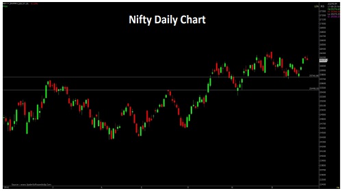 Nifty opened on a flat note but witnessed buying momentum in the first half however selling in the second half led the index lower toclosenear day's low. Nifty closed at 26142 with a loss of 35 points. On the daily chart the index has formed a small Bearish candle withupper shadowindicating selling pressure as well as resistance at higher levels. The chart pattern suggests that if Nifty crosses and sustains above26240level itwould witness buying which would lead the index towards 26300-26350 levels. Important Supports for the day is around 26120Howeverifindex sustains below 26120 then it may witness profit booking which would take the index towards 26060-25950 levels.