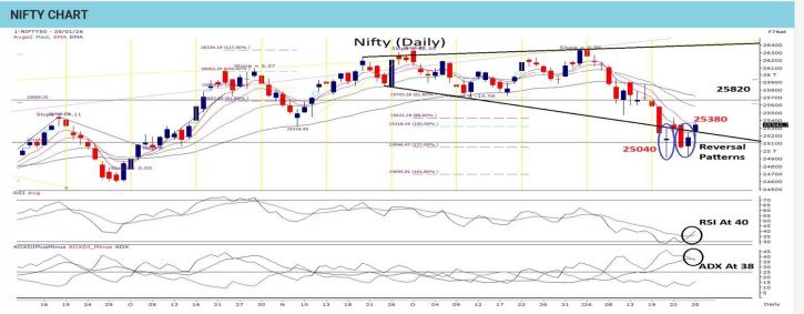 The convergence of the 200 DEMA at 25160 and the weekly 50 WEMA near 24990 has created a strong demand zone, making it a likely area for termination of the ongoing corrective phase. Nifty sustaining above this region reinforces its importance as a key near-term support. The appearance of a Spinning Top followed by a Bullish Harami indicates early signs of a potential rebound. Options data supports this view, with firm put writing around the 25000 strike, while upside remains capped near 25500, defining a clear trading range. On the upside, 25585 continues to act as a crucial resistance, coinciding with the earlier Bearish Belt Hold pattern and reflecting persistent supply pressure. A decisive and sustained close above 25585 is required for a meaningful trend reversal. Structurally, price action near the lower boundary of a Broadening Pattern suggests the potential for sharp swings, keeping the broader setup neutral to cautiously optimistic.